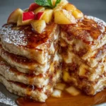 Fluffy pancakes infused with the comforting flavors of apple pie, served with delicious vanilla maple syrup.