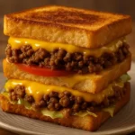 A delightful twist that combines the rich flavors of a cheeseburger with the comforting goodness of a grilled cheese sandwich.