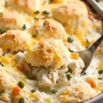A comforting and easy chicken pot pie casserole with a creamy filling and flaky biscuit topping, perfect for busy weeknights.