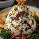 A festive and creamy cheese ball with tart cranberries and crunchy pecans, perfect for holiday gatherings.