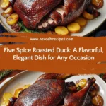 A show-stopping dish featuring a whole duck roasted with fragrant Chinese five-spice, resulting in crisp skin and richly flavored meat.