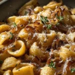 A comforting pasta dish combining the sweetness of caramelized onions with melted cheese, evoking the rich flavors of French onion soup.