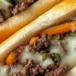 Juicy, cheesy Philly cheesesteaks with savory ground beef, melty cheese, and colorful peppers, all packed into a soft hoagie roll.