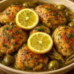 A flavorful dish combining juicy chicken, tangy lemon, savory olives, and tender artichokes, embodying the essence of Mediterranean cuisine.