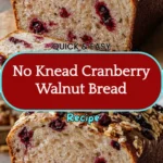 No-knead cranberry walnut bread is an easy, rustic loaf with crisp crust and a tender, slightly chewy crumb studded with tart cranberries and toasty walnuts. I make this when I want homemade artisan bread without hours of hands-on work — it relies on time, not effort. After testing several ferment times and mix-ins, I landed on a reliable method that balances flavor and texture every time.