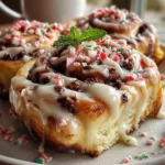 Festive cinnamon rolls with peppermint bark and white chocolate glaze, perfect for breakfast or dessert.