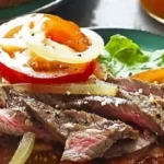 Start by seasoning a 1–1½ lb flank or skirt steak with salt, pepper, and a light brush of olive oil. Sear on high heat in a preheated cast-iron skillet for about 3–4 minutes per side for medium-rare (target 130–135°F internal), then rest 5–10 minutes before slicing thinly against the grain. Meanwhile, thinly slice one large sweet onion and sauté over medium heat in 1 tbsp butter or oil until softened and just starting to caramelize, about 8 minutes; thick tomato slices and toasted bread complete the assembly. Expect a quick pan-cook for the steak and a short sauté; timing is key so everything is warm at assembly.