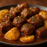 A tender and flavorful dish featuring beef bites and potatoes, slow-cooked in garlic butter.